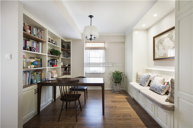 簡潔明亮的配色清爽明快,深色木地板突出質樸、優雅的感覺。美式的燈具增加濃厚的美式氛圍。