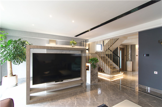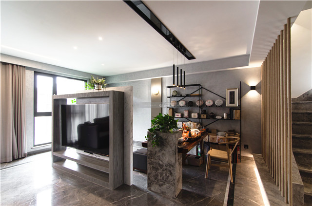 木質電視背景墻,木材的溫厚提升空間溫度,隔而不斷的設計,既做到了功能的適用,空間的區隔,也增加了空間的通透感和靈動活潑。