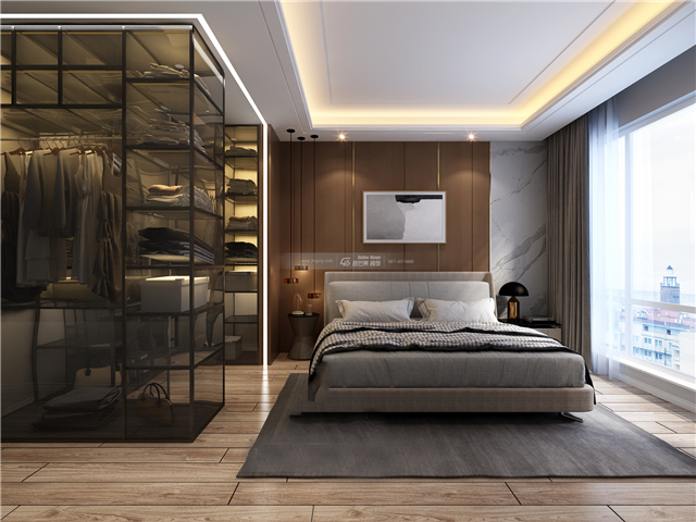 臥室風格延續(xù)客廳的現(xiàn)代極簡風,低調(diào)帶有輕奢感的配色,減少過多的包裝設(shè)計從而打造更加舒適簡潔的臥室環(huán)境。個性的衣柜增加空間通透性和個性。
