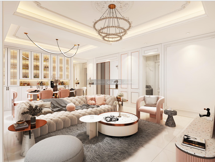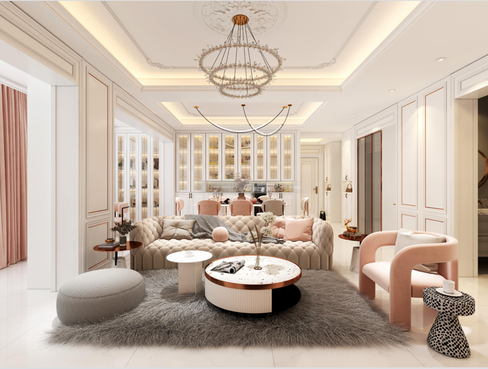 全屋營(yíng)造華麗、有儀式感的輕奢家居氛圍,突出家居質(zhì)感,粉粉嫩嫩的感覺(jué)讓家居少女感滿溢。客廳超大的雕花燈盤,精致又浪漫。溫柔可愛(ài)的沙發(fā)配上粉色的馬卡龍色系單椅,精致的圓形茶幾,讓家變得溫馨又有儀式感。