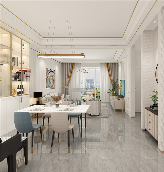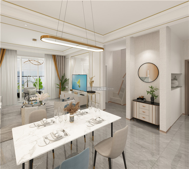 客廳和餐廳顏色和諧統一,溫馨的配色舒適清新,精致的餐邊柜帶來華麗的儀式感。
