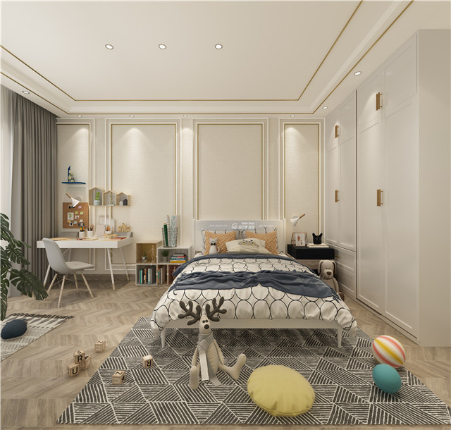墻面的造型品質感滿滿,一門到頂的簡約衣柜,門板搭配香檳金把手,溫暖舒適的同時又不失高檔大氣。