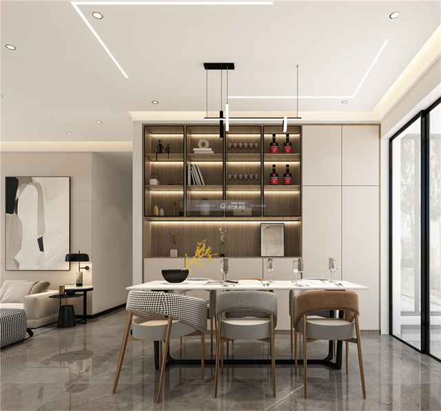 原木色桌椅和原木色的展示柜,讓該空間給人帶來了溫馨感,餐桌臺面使用的是白色花紋的巖板,整體的搭配讓這個小小的區(qū)域顯得十分的精致。