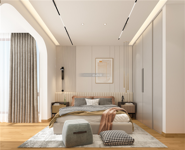 整體的顏色把臥室承托得溫馨而舒適,帶來很舒服的居住感受。溫馨的顏色里融入精致的小吊燈和裝飾畫,讓家居更加靈動。柜體做到一門到頂,拉伸了整個空間。