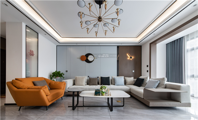 簡(jiǎn)約的氣質(zhì)下,新家的現(xiàn)代時(shí)尚感展露無(wú)疑。沙發(fā)背景墻融入木飾面,溫暖細(xì)膩的家居體驗(yàn)油然而生。橘黃色沙發(fā),在點(diǎn)亮空間溫暖氛圍之余,增加了一絲摩登的韻味。