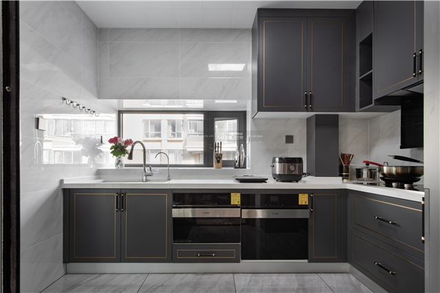 直白的線(xiàn)條表達(dá)自由的空間態(tài)度,金色線(xiàn)條增加輕奢感。柜體的顏色搭配不禁讓空間多了一些優(yōu)雅的格調(diào),讓烹飪變得更加高級(jí)。