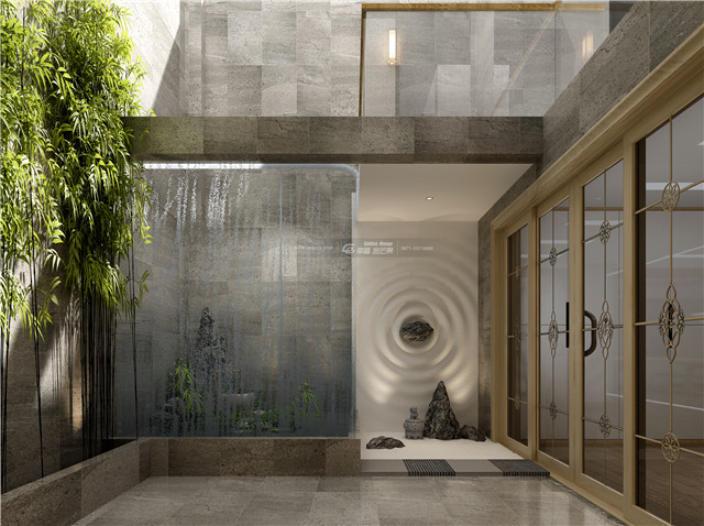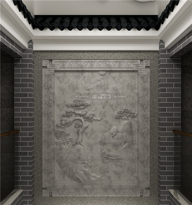 “壁間水墨畫,為爾拂塵埃。”水墨畫仿佛和大理石墻面融為一體,揮毫幾筆,東方禪意全出。