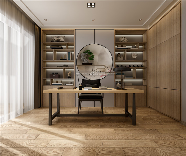 從現(xiàn)代的元素里面尋覓了顏色、材質(zhì),通過東方禪意美學(xué)的組合,將喧囂張揚(yáng)的明黃原木與水墨重組,為書房的沉靜空間提了亮。