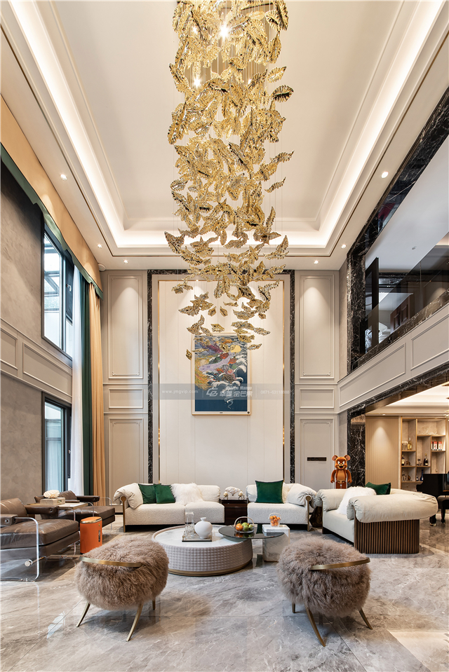 恢弘的石材背景墻搭配跳色的香檳色不銹鋼線條,挑高的豪氣設計,豁然大氣,氣度非凡,張弛有度。屬于大宅的奢華感和穩(wěn)重感彰然顯現(xiàn)。