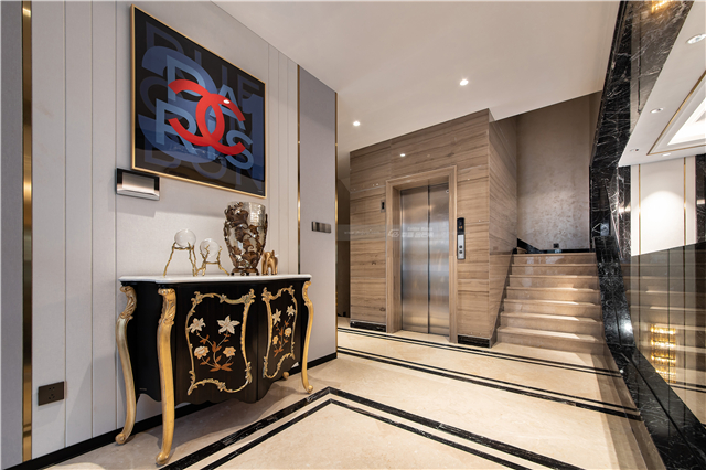一整面的黑色石材背景墻蘊含空間的制衡之道,黑白交錯間上演華美的大宅故事。