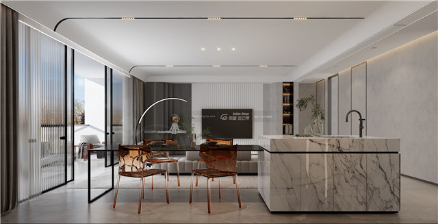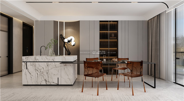 石材本身的冰冷高級感賦予空間更多的品質(zhì),亞克力板餐椅精致又有格調(diào),光影流轉(zhuǎn)間一切都變得更有華美感和儀式感起來。