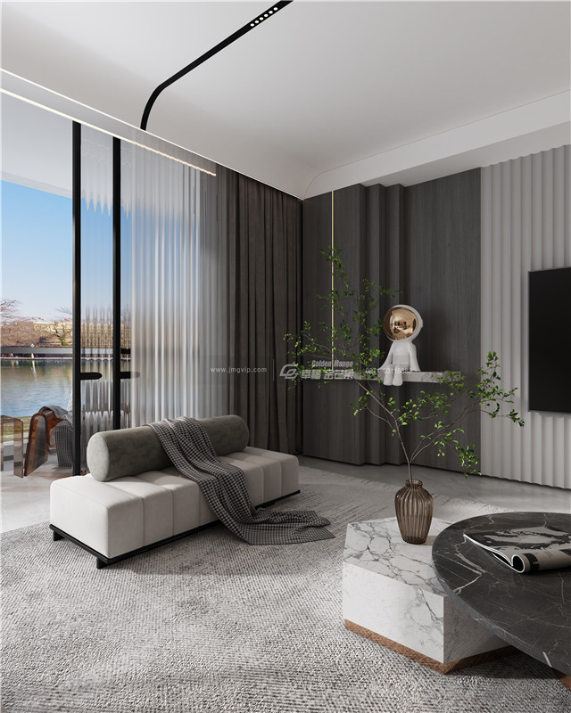 無主燈設計將空間氛圍感進一步提升,灰色帶來的沉靜感仿佛讓空間有了更多沉思的不受外界干擾的自由氣息。電視背景墻格柵處理提升空間層次感。一盞落地燈,跟營造了一些寫意氣息。