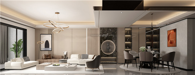 整體是優雅又高級的顏色,和光影搭配起來,展現低調的華麗感。顏色優雅,質感高級的餐桌椅把空間檔次提升起來。硬包的沙發背景墻看起來質感滿滿??蛷d和餐廳以黑色大理石作為空間區隔,一切都是在營造輕奢的華麗感。