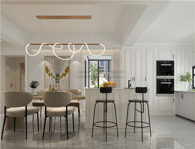 以象牙白為基調,整體奢華而充滿儀式感,營造儀式感滿滿的用餐空間。奢華的造型,精致的餐具,中西廚結合的餐廚空間,盡情展現大宅氣度,彰顯貴族般的質感生活。