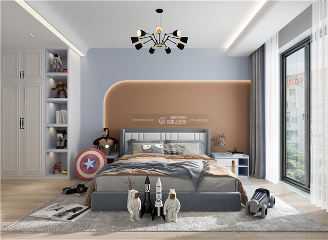 床頭背景墻是一整面的動漫人物,充滿無限的想象力和創造力,不斷突破桎梏,孩子的未來擁有著無限的可能。