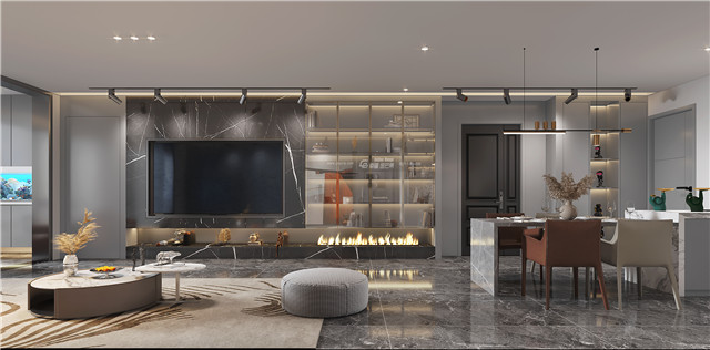 整體是非常個性時尚的裝修格調,一入戶就能感受到屋主與眾不同的個性主張?;疑匕宕u和灰色大理石電視背景墻,電視柜等,奠定優雅的格調。電視背景墻搭配玻璃的收納柜,若隱若現營造朦朧的時尚感。用燈帶和軌道燈在背景上投下光影效果,氛圍感更佳。