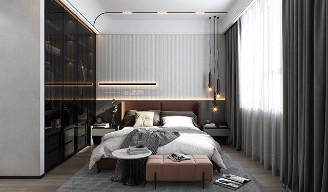 臥室整體簡潔灰的空間,從墻面、窗簾、床單的硬裝與軟裝都采取簡約灰的設計,使得空間趨于簡單舒適為主。