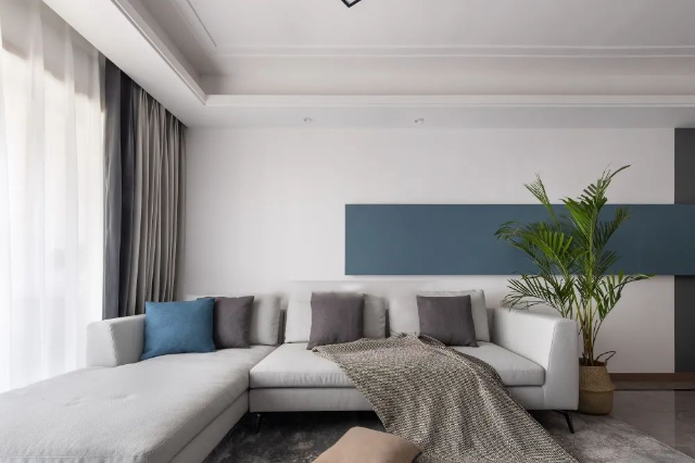 客廳整體空間為淺色系,線條簡潔硬朗,簡約白的背景色,奠定了空間低調的質感、優雅的基調。設計師巧妙運用質感的石材以及自然元素賦予空間生動輕靈的魅力。