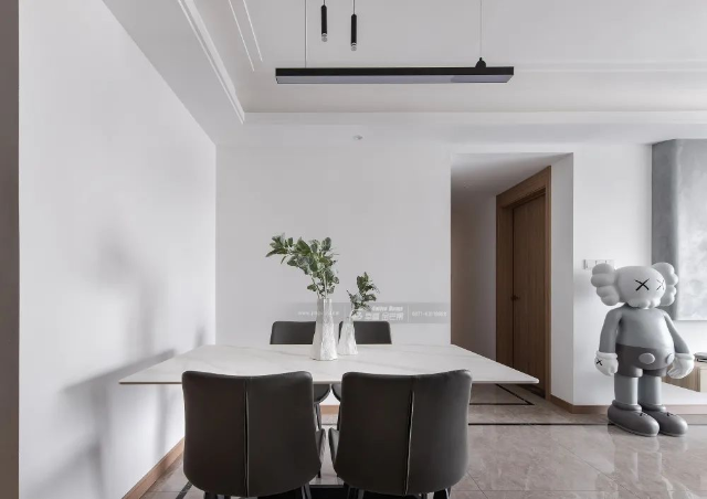 簡潔大氣的白色基調,搭配清新的綠植,加上頗有藝術感的卡通雕塑的襯托,整個空間簡單有序,層次自然。