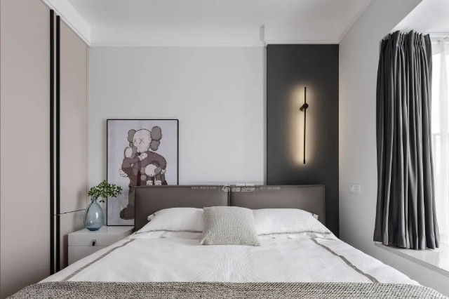 床頭背景墻使用木紋拼貼鑲嵌金屬條用以分割,提取自然及生活中的美學元素,構筑出藝術氤氳的舒適空間,