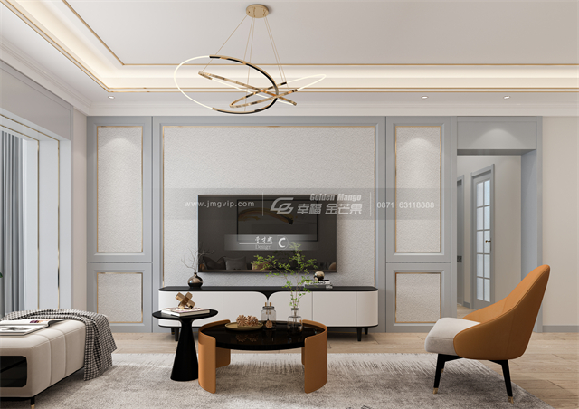浪漫邂逅開場,如同故事的序章。整個客廳空間,藍色+白色的主旋律,細膩溫潤的色澤在低灰度與飽和度的色覺暈染下呈現著優雅脫俗的超凡氣質。灰藍色背景線條調性低奢,灰色沙發融合橘色點綴,演繹出一種“低調的奢華”,令空間質感更為飽滿。
