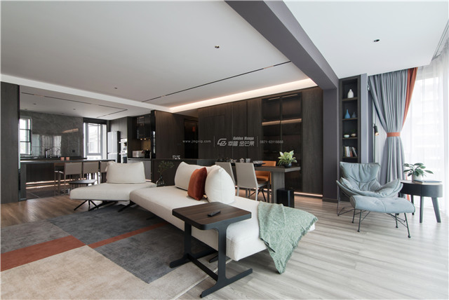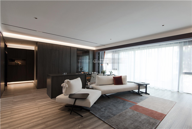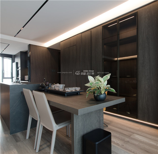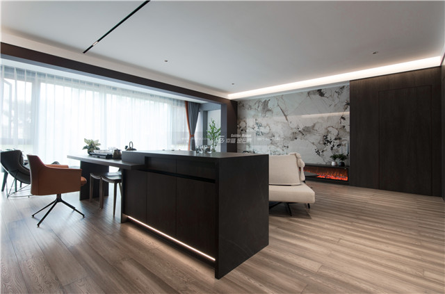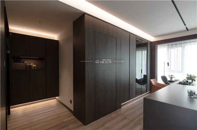 門、矮柜、門套選用高級整木定制,大面積定制柜體和墻板,便有了呈現出來的顏色和諧統一的效果,空間感更佳。