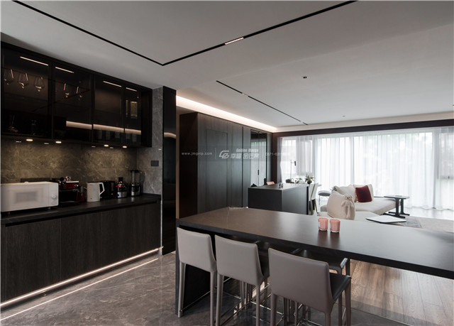 享受獨處帶來的安逸舒適,明先生也喜歡幾多好友聚在一起聊天交心的時光,于是客廳里就有了這個茶桌和調酒臺。中式茶韻,西式情調,滿足明先生不同的社交方式。