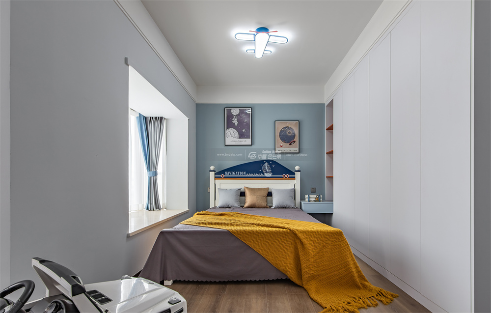 孩子的世界是五顏六色的,以藍色為主色調,簡約且不失童趣。藍色床頭背景墻、宇宙星球的卡通畫、揚帆起航的床、藍色飛機燈,為空間增添了不少童真與樂趣。