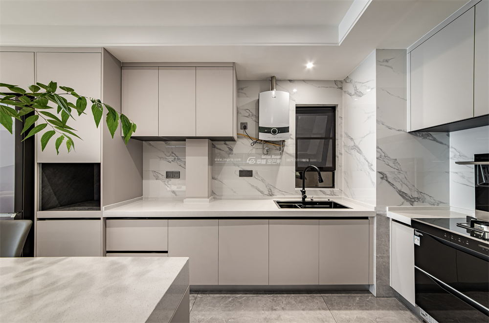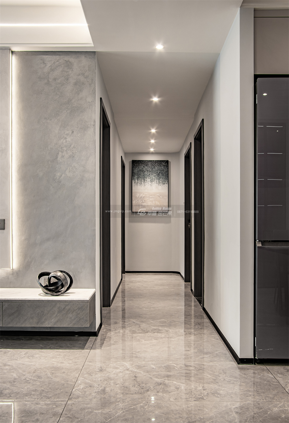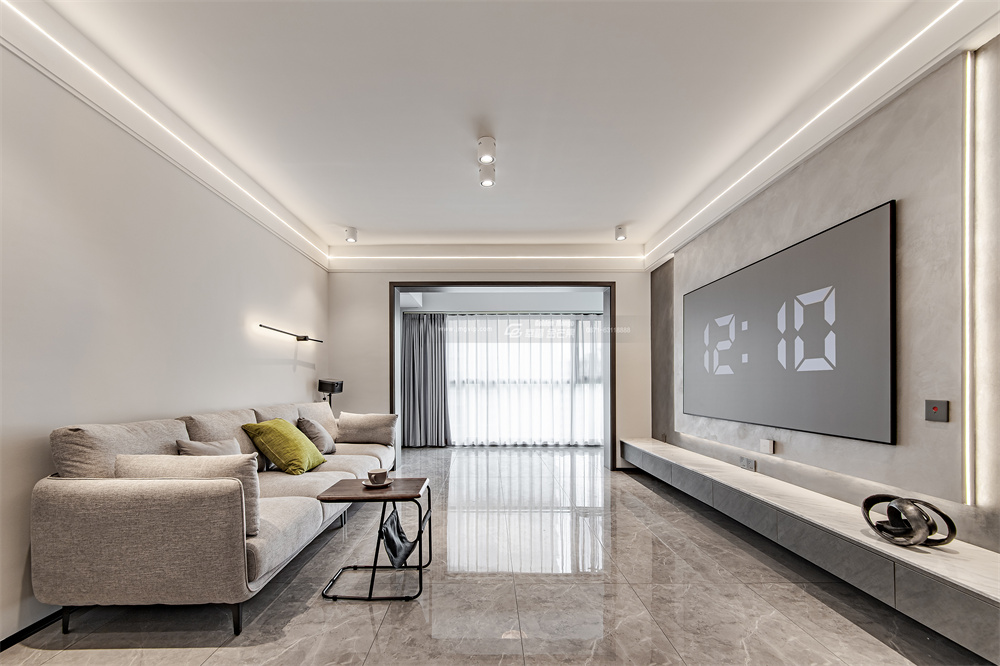 客廳以灰白色為基調,采用無主燈設計,吊頂處安裝燈帶、筒射燈,讓整體空間干凈利落,去除多余的飾品,突顯出生活的品質感。