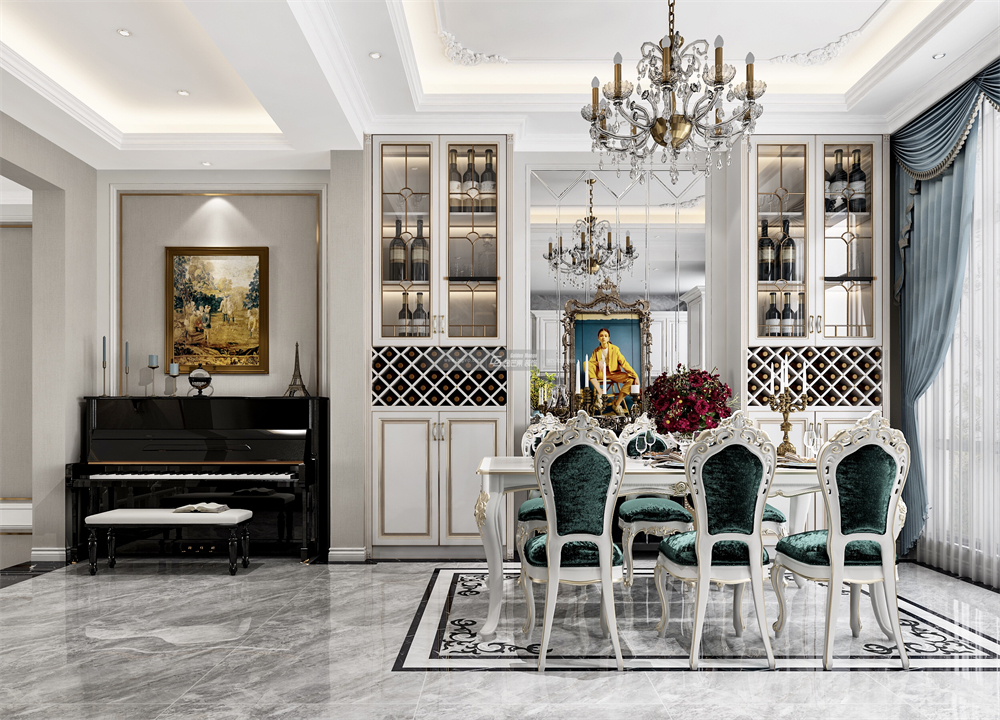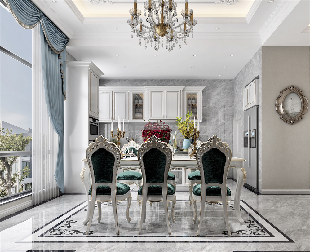 湖藍(lán)色的羅馬簾蘊(yùn)含優(yōu)雅氣質(zhì),使空間增添了幾分美感,同時(shí)也為空間帶來一股濃濃的藝術(shù)氣息。歐式宮廷的餐桌椅復(fù)古又經(jīng)典,仿佛穿越到了古代歐洲,在這樣充滿情調(diào)的餐廳就餐,每天都是一種享受!