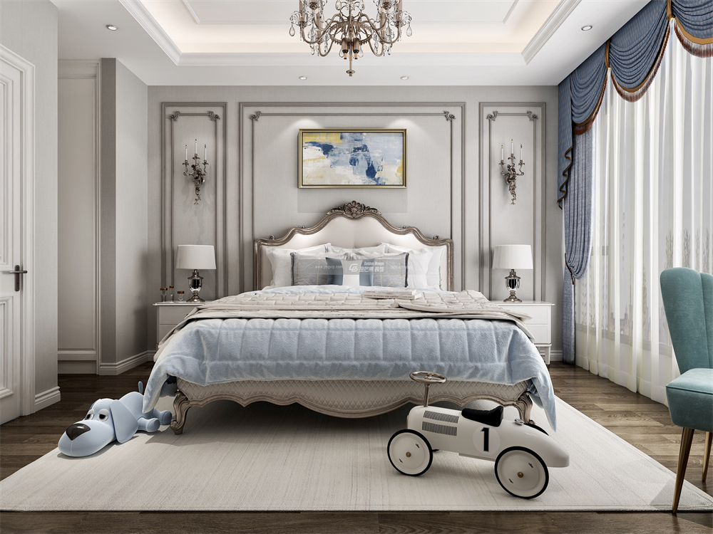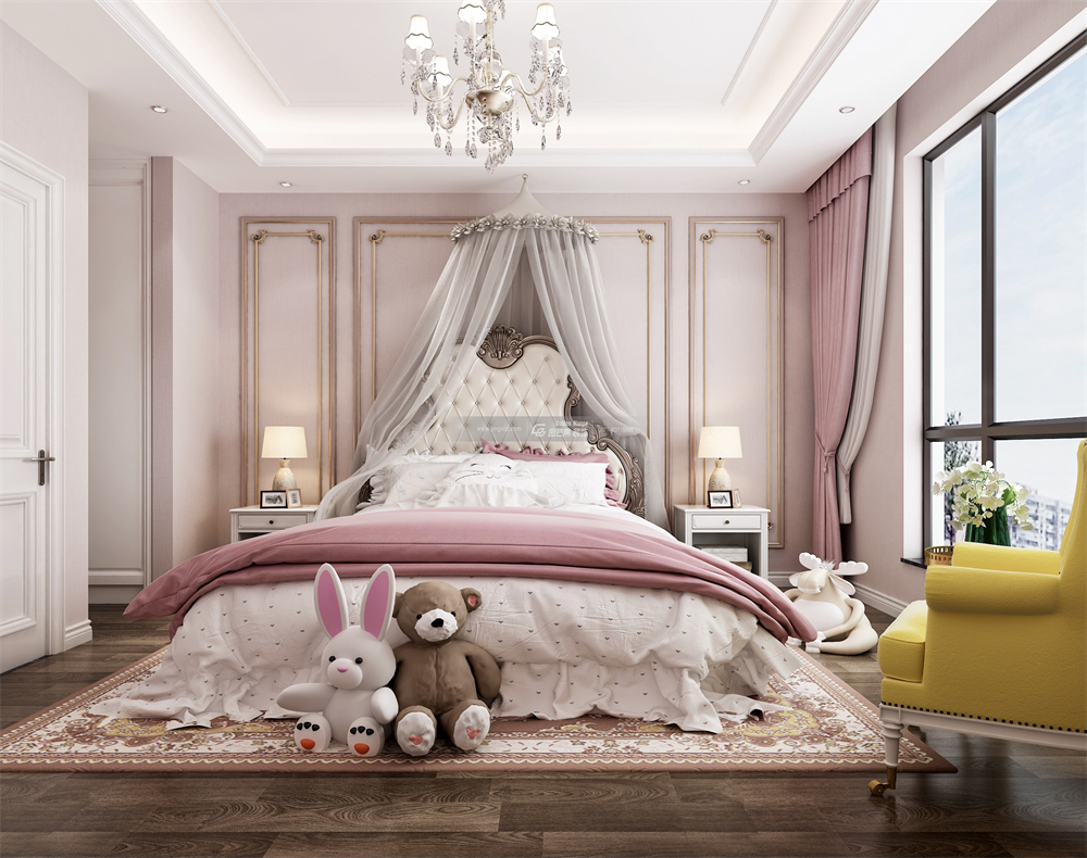 兒童房選用淺色系來打造,既保留歐式的風(fēng)韻,又加入了兒童喜歡的色彩、卡通元素!