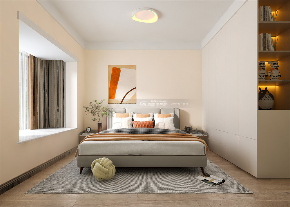 主臥簡(jiǎn)約舒適的家居布置下,空間自帶輕松氛圍,橙色元素的點(diǎn)綴,提亮空間整體色調(diào)。熱情洋溢的愛(ài)馬仕橙與沉穩(wěn)低調(diào)的灰白色系搭配,兩者融合得不會(huì)讓色彩太炸眼,冷暖交融,平衡過(guò)渡得剛剛好。