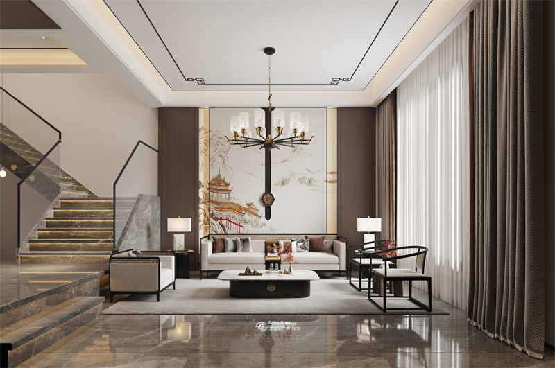 背景墻是大幅的水墨山水傾瀉而下,挑空的設計更顯別墅空間的氣勢恢宏,同時也彰顯出屋主高瞻遠矚的生活態度。一進入空間,一番自由大氣的遼闊景象躍然于眼前,提升居住舒適感。