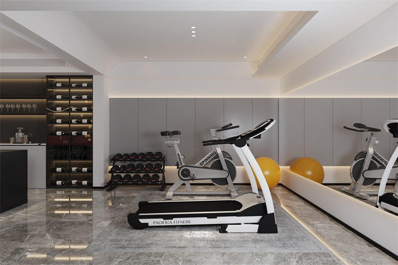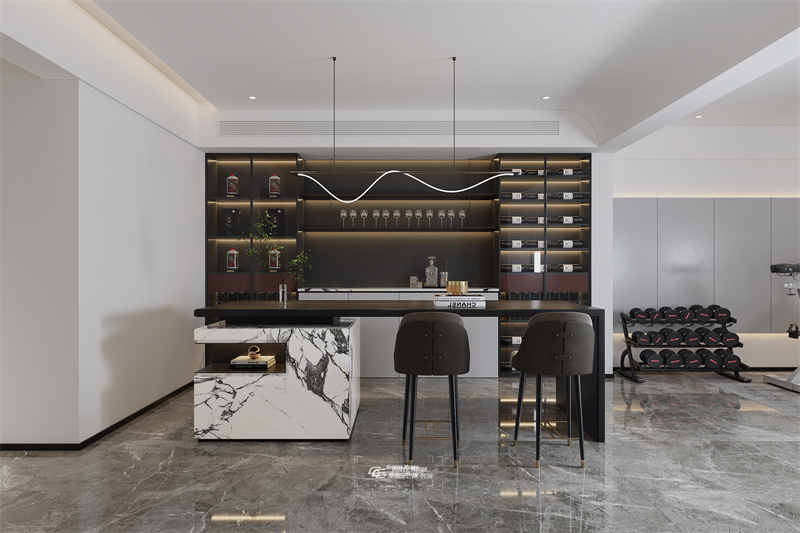 靜謐而雅致的空間內,白色與灰色交織成一幅簡約而不失格調的畫卷,一側是吧臺,一側是健身房,簡約而不失雅致的空間,展現出和諧而統一的美感,完善的功能區給予別墅大宅超舒適的居住體驗。
