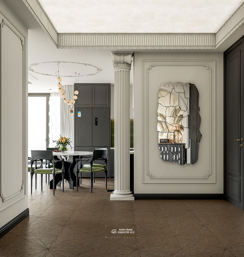 每到用餐時分,家人圍坐,美食飄香,溫馨的氛圍在空間中蔓延,讓日常的每一餐都成為生活的儀式。走廊:藝術的悠長回響走廊雖為過渡空間,卻被賦予了獨特的生命力。墻面的裝飾畫與線條造型,猶如跳動的音符,為歸家之路增添藝術韻律。地面紋理與整體風格呼應,漫步其中,仿佛穿梭在藝術長廊,讓每一次歸家都充滿期待。