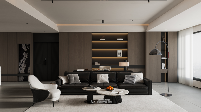 現(xiàn)代簡(jiǎn)約風(fēng)客廳,深木色鋪陳沉穩(wěn)基調(diào),黑皮沙發(fā)與淺調(diào)單椅碰撞質(zhì)感,圓形大理石茶幾串聯(lián)空間韻律。背景墻嵌入燈帶,落地?zé)艋∮皳u曳,明暗間,陳列架上的器物悄然訴說(shuō)秩序與格調(diào)。
