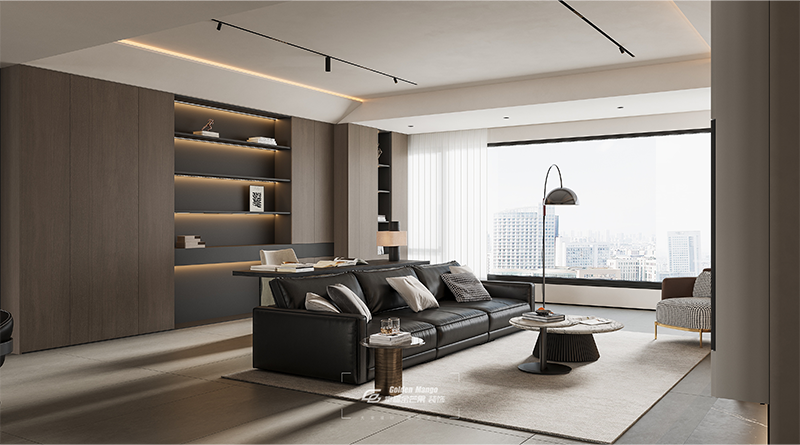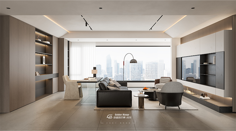 落地窗如巨幕框定城市天際線,現(xiàn)代客廳在硬朗與溫潤(rùn)間游走。