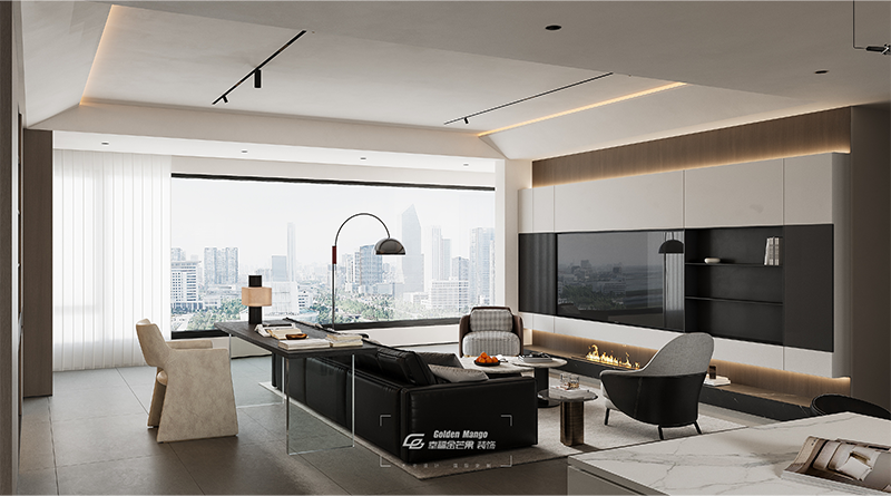 黑色皮沙發(fā)呼應(yīng)壁爐星火,異型單椅、玻璃支腳案臺(tái)拆解厚重,線性燈暈漫過(guò)墻面。材質(zhì)碰撞間,開闊視野與精致細(xì)節(jié)交融,織就都市棲居的從容韻律。