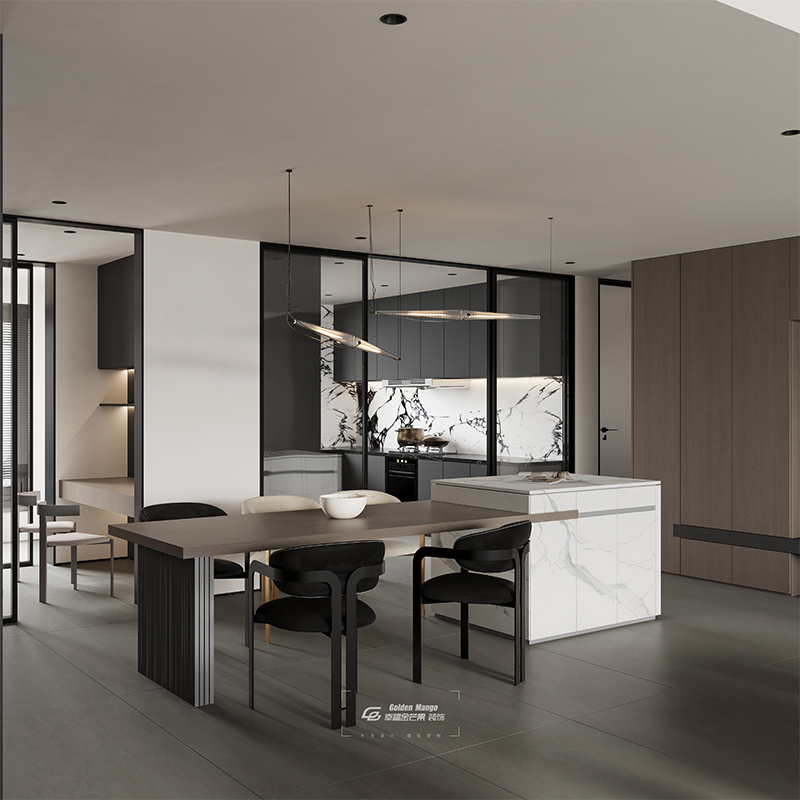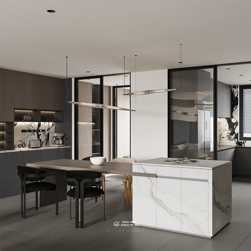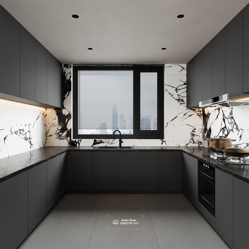 黑灰櫥柜筑就利落秩序,大理石墻似水墨潑灑肆意。嵌入燈帶暈開柔芒,百葉窗濾進(jìn)城市微光。冷峻材質(zhì)與流動(dòng)紋理碰撞,在這方餐廚場(chǎng)域,把煙火日常暈染成高級(jí)詩(shī)意 。