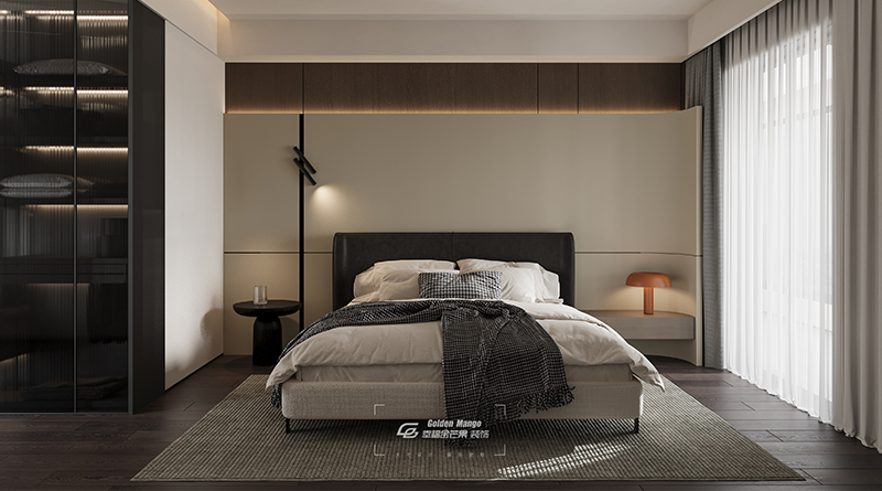 暖棕與深黑勾勒睡眠場(chǎng)域,線性燈暈漫過(guò)床頭柔化邊界。玻璃衣柜藏起秩序,不對(duì)稱燈盞灑落清輝,格紋毯添幾分松弛。紗簾濾進(jìn)微光里,每道線條都在訴說(shuō):喧囂外,獨(dú)屬休憩的靜謐詩(shī)行 。