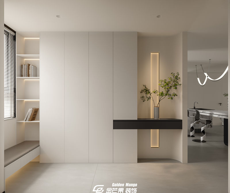 n 作為家的第一印象,玄關的設計既要實用,又要彰顯品味。金芒果在這里做了一個 L 型的玄關柜,底部留空方便放置常穿的鞋子,中間的臺面可以隨手放下鑰匙與包包,上方的柜體則能收納換季的衣物與雜物。最讓人驚喜的是玄關柜上的細節—— 一盞小小的臺燈,一個造型別致的花瓶,幾支新鮮的綠植,讓每天出門與回家都充滿了儀式感。