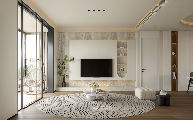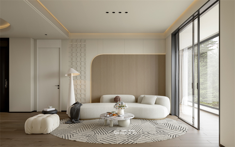 空間以 “淺色系 + 木質肌理” 為基底,弱化了現代風格的冷硬,多了份松弛親和:造型圓潤的白色沙發像一朵 “云”,慵懶地承接生活的閑逸;黑白紋理的圓形地毯如藝術畫布,為空間錨定 “隨性又精致” 的基調。