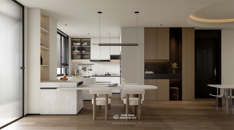 餐廚區采用開放式設計,讓空間感徹底解放。餐廳里,圓形餐桌柔化了線條棱角,搭配簡約長吊燈,“儀式感” 悄然流露;一旁的中島臺是 “多面手”—— 既是料理時的輔助臺,也是家人小聚的 “咖啡角”,擺上鮮果、杯盞,生活的小確幸便在光影里流轉。