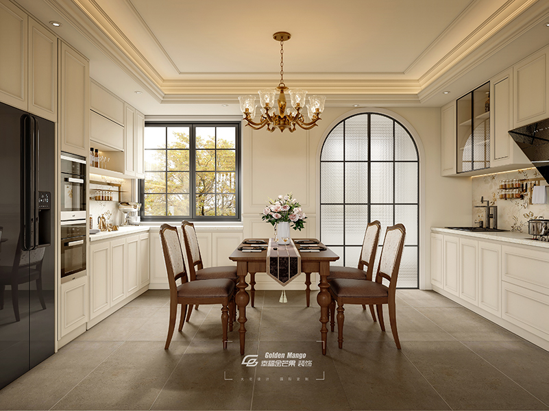 穿過(guò)客廳,餐廚區(qū)域如同一幅精美的生活畫卷徐徐展開。開放式布局讓空間通透靈動(dòng),奶白色櫥柜與金色把手相得益彰,彰顯著生活的精致與儀式感。