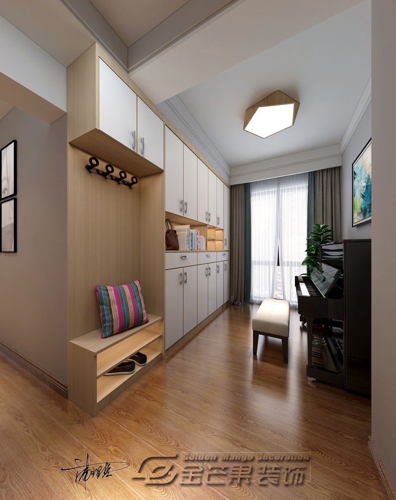 進門玄關鞋柜處,擺放一臺鋼琴,方便小朋友休息的時候談練鋼琴,同時一家人都能欣賞到音樂。