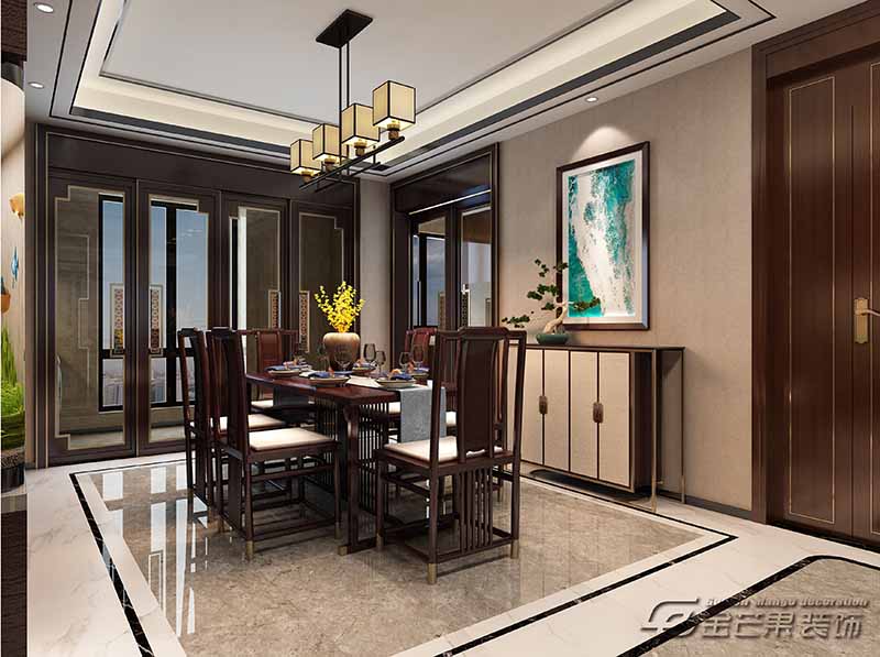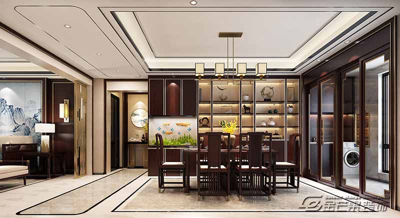 與廚房相連的餐廳,布置的也比較仿古化,實(shí)木六人桌與背景墻上壁畫(huà)、嵌入式魚(yú)缸相得益彰。方形的天花上垂墜的吊燈,高低間展現(xiàn)出古雅韻調(diào)。