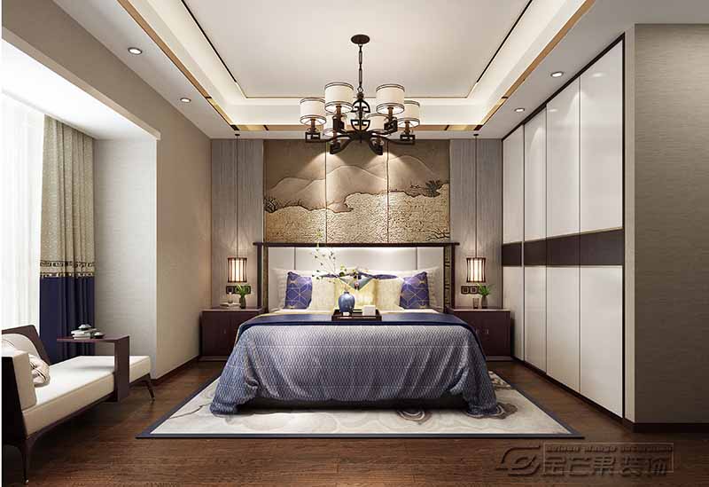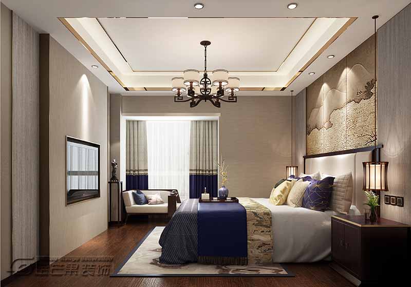 臥室運(yùn)用暖色調(diào)的墻布做裝飾,床品素雅色調(diào)與窗簾呼應(yīng),形成視覺(jué)上的整體性。床頭吊燈色調(diào)清雅,與山水畫(huà)碰撞,燈帶線條與床頭宛如一體。局部一抹藍(lán)色,打破厚重點(diǎn)綴出活力。