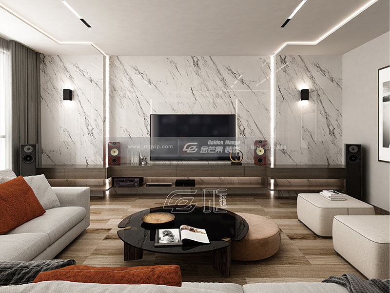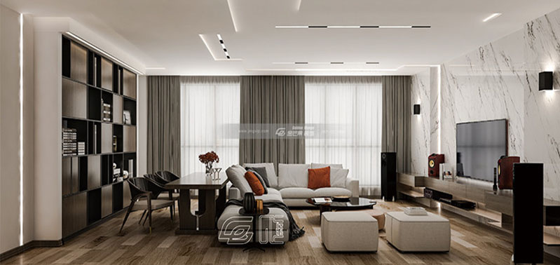 在客廳的設計上大膽運用軟裝和硬裝的結合,營造舒適、寬敞的體驗。地板材料使用木質的地板,更加有品質,在實際的使用體驗上也有強烈的反饋。舒適的休閑沙發也是疲倦時的一大支撐,大理石的電視背景墻更顯雅致、美觀。四個音響的配置,享受著影音的最大魅力,落地窗在整體寬敞、明亮的這一感受中顯得尤為重要,美觀實用的燈帶代替主燈的設計。這是對現代風格最好的詮釋。