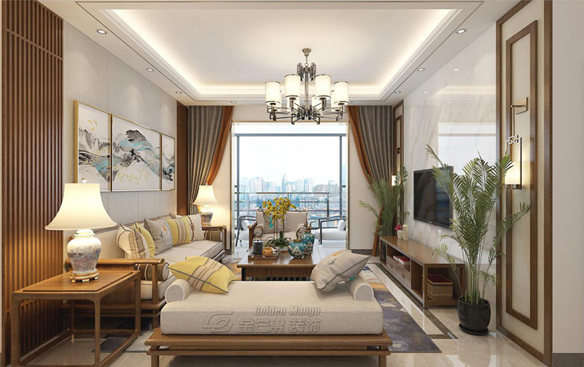格柵背景相互呼應,水墨畫呼之欲出,陽臺和客廳用深色窗簾隔開,客廳三件套(沙發(fā)、茶幾、電視柜),既傳承著中式風格,也更加質(zhì)樸、實用。富有紋理乳白色的大理石作為電視背景墻,品質(zhì)和奢華彰顯無疑。桌上的燈盞附帶著濃厚的歷史氣息。綠植點綴空間,感受自然的清新。