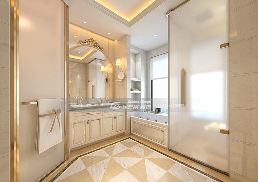 干濕分離才是最基本的,磨砂的玻璃門,若隱若現,神秘美觀。鏡框的設計是一頂皇冠,以壁燈照亮你的美,怎么少得了浴缸的搭配,盡情放松疲憊一天的身體。整體盡顯高貴、奢華。
